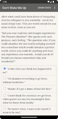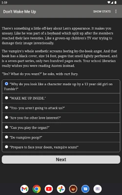 "Don’t Wake Me Up" is a 400,000-word interactive novel about love in video games, where your choices control the story. Entirely text-based, and driven by your imagination. It is written by Baudelaire Welch, a professional game screenwriter currently working as a companion character designer for RPGs.