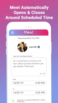 Meet professionals and influencers set their industry and niche in search settings around their available time and price for daily or long-term meeting options and shares. Meet does the rest, by posting their availability on Meet and allowing clients to book their services. Meet professionals can also accept meetings based on requests and do not have to post available time. Meet is safe and easy to use. Put yourself on Meet and get paid for your time while connecting and meeting with other users and your clients.