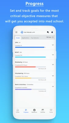 • Progress –Set and crush individual goals for GPA, MCAT score, shadowing, volunteering, extracurricular activities, required courses, letters of recommendation, etc.