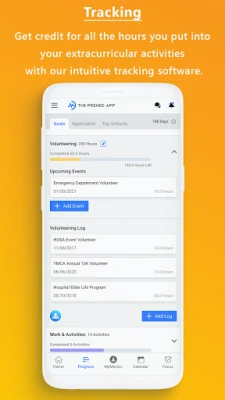 • Tracking – Keep track of all of your shadowing, volunteering, research, and other extracurricular activities with our intuitive tracking software.